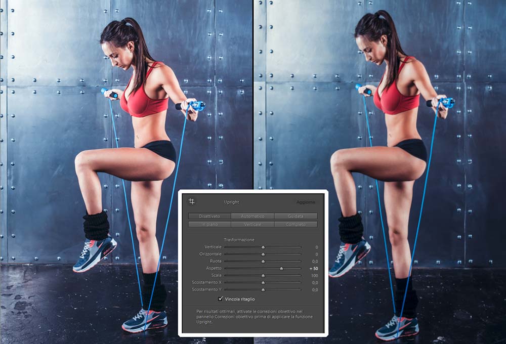 Un utilizzo alternativo di Trasformazione consiste nell'utilizzare il solo cursore Aspetto per alterare le proporzioni di una figura umana, allungandola per ottenere un effetto "snellente" simile a quello prodotto automaticamente in-camera da alcuni modelli. È evidente che si tratta di una tecnica grossolana, ma ha il pregio dell'estrema semplicità.