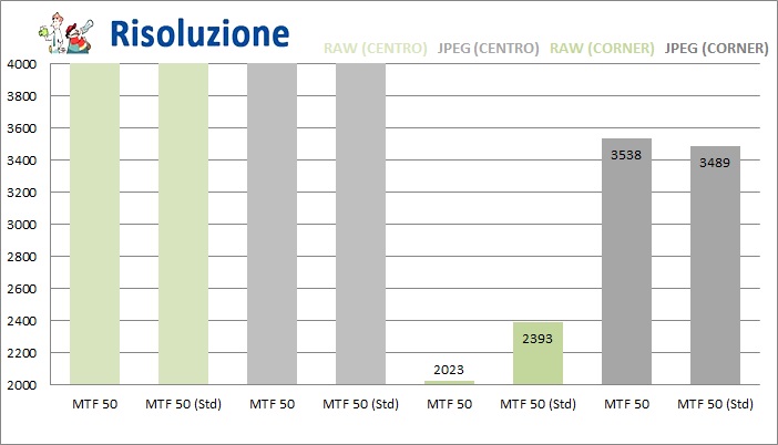 Abbiamo deciso di mantenere la scala del grafico limitata a 4000 LW/PH per sottolineare l'eccezionalità di questo modello, che per l'esattezza fa registrare 4316 LW/PH (RAW, sharpening standard, centro immagine). Il punteggio relativamente modesto del RAW ai margini del fotogramma è ovviamente imputabile all'ottica, non certo al sensore.