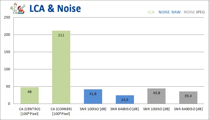 Il rapporto segnale/rumore colloca la D850 nella parte alta della classifica delle fotocamere 35mm, il che è un risultato di tutto rispetto considerata la densità di pixel. La rivale Sony A7R-III riesce però a fare ancora meglio. Di nuovo, l'elevata aberrazione cromatica laterale è un difetto imputabile all'ottica, i cui limiti ai margini del fotogramma vengono esasperati dalla risoluzione del sensore.