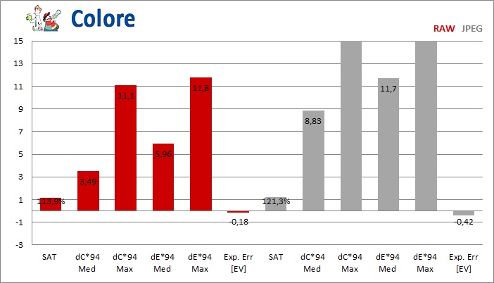 Come altre Nikon, leggera tendenza alla sottoesposizione. Con il Picture Control Standard, a cui si riferiscono i dati qui riportati, il colore è molto saturo, ma chi preferisce i colori fedeli non deve fare altro che optare per "Neutral", ottenendo così un errore cromatico dC94 di 2,54 punti con una saturazione del 102,8%, praticamente perfetta.