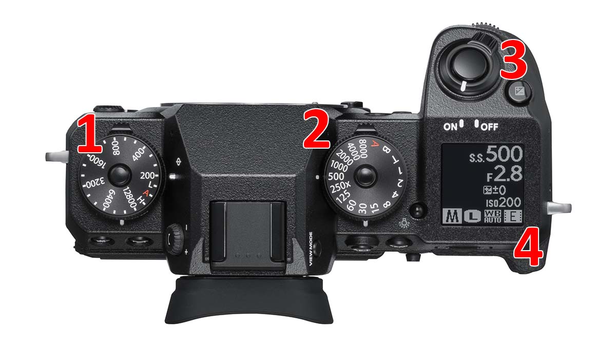 1 – Doppia ghiera concentrica, a sinistra, per sensibilità ISO e modalità di avanzamento, che nell'accezione Fujifilm imposta anche modalità filmato, Filtro avanzato e Panorama. La posizione "L" sulla ghiera superiore può corrispondere, a scelta del fotografo, a 100, 125 o 160 ISO, mentre la posizione "H" può corrispondere a 25.600 oppure a 51.200 ISO.