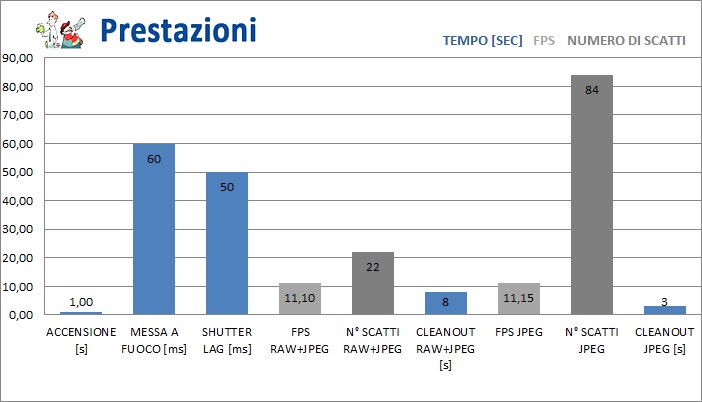 L'accensione è rapida e le prestazioni, tanto in termini di reattività del sistema AF quanto in termini di scatto continuo, sono elevate in assoluto ma non superiori a quelle della più economica X-T2 (anzi, la durata della raffica è leggermente inferiore). Probabilmente, l'adozione di memory card più performanti avrebbe potuto aiutare in questo senso.