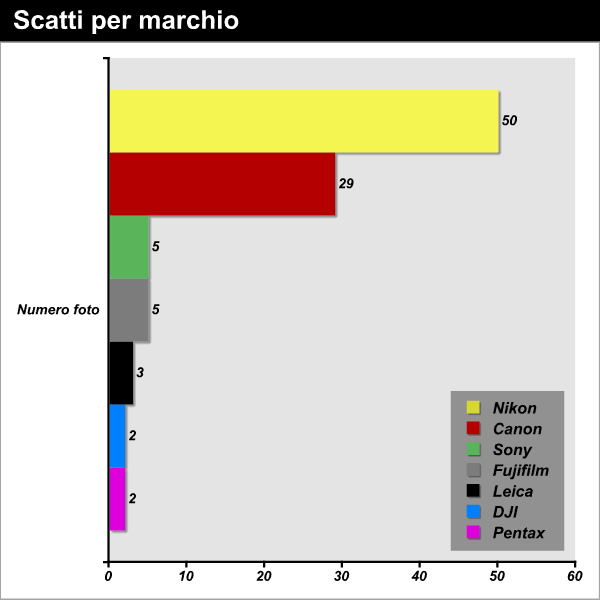 Fra le foto premiate e di cui si dispone di metadati spicca su tutti il marchio Nikon con 50 scatti su 96. A seguire troviamo Canon con 29 scatti. Da Notare come Nikon (52,8%) e Canon (30,21%) siano i brand che messi assieme costituiscono l'82,9% del totale. A seguire troviamo Sony e Fujifilm, ognuno con il 5,21%, poi Leica (3,13%), DJI e Pentax (2,08% per entrambe). La prima sorpresa è vedere DJI fra i colossi della fotografia, ma è indubbio che i droni siano ormai entrati a far parte del settore in maniera del tutto fissa. Vedremo più avanti di che modello si tratta.