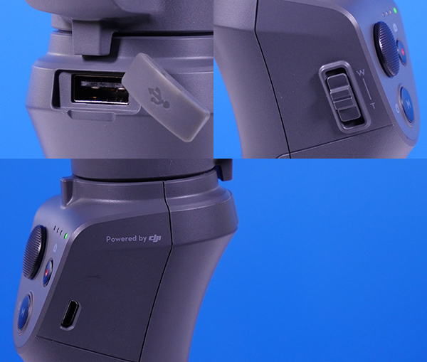 Rispetto al modello precedente ha fatto grandi passi in avanti l'autonomia. Con un cellulare montato correttamente, in modo da minimizzare lo sforzo dei motori per il suo sostegno, ora si può arrivare a 15 ore di utilizzo. Con il primo modello, lo ricordiamo, l'autonomia operativa si aggirava attorno alle 3/4 ore. Rispetto alla prima Osmo Mobile la batteria non è sostituibile (Osmo Mobile 2 utilizza una batteria tipo 18650 LiPo da 2600 mAh non accessibile), ma l'aumento dell'autonomia compensa totalmente questo particolare. Anche la ricarica è più semplice: prima era necessario portare con sé l'apposito cavo con mini-jack, mentre ora la porta microUSB amplia di molto la compatibilità coi cavi che normalmente troviamo nelle nostre borse e zaini. Troviamo nella parte frontale un'altra porta USB, in questo caso di tipo classico A: serve per dare energia al cellulare in caso quest'ultimo avesse la propria batteria scarica.