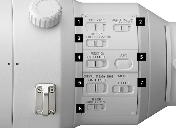Il pannello di controllo riflette la complessità delle funzioni, offrendo: (1) Selettore AF/MF. (2) DMF On/Off. (3) Limitatore di corsa AF in corrispondenza dei 7m. (4/5) Impostazione Function/Preset. (6/7) Impostazioni stabilizzatore. (8) Segnale acustico.