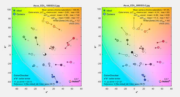 Discreto, per uno strumento non professionale, il comportamento cromatico, anche se la saturazione dei colori si riduce rapidamente al crescere della sensibilità di lavoro, e già a 800 ISO scende sotto la soglia ottimale del 100%.