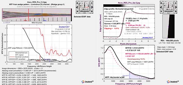 L'Asus ZenFone 5z offre buona nitidezza e livello di dettaglio in condizioni standard, con punteggi MTF normalizzati nell'intorno delle 1700 LW/PH (punteggi confermati da analisi visiva e metodi di calcolo hyperbolic wedge). Punteggi massimi rilevati con il metodo slanted edge sensibilmente superiori (2144 LW/PH) in virtù dell'elevato livello di sharpening tipico degli smartphone (Oversharpening: 19,9%).