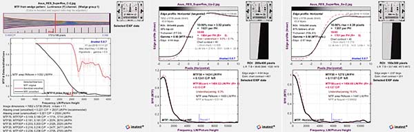 Sopra: la nitidezza dell'ottica grandangolare è da dimenticare. Sotto: analisi della funzione SuperRes - al centro del fotogramma, assicura effettivamente un piccolo margine di vantaggio (vedi punteggio hyperbolic wedge, grafico di sinistra). L'ottica, però, non è all'altezza, e già in punti medi del fotogramma i punteggi scendono sotto quelli registrati con risoluzione standard (grafico al centro); le cose ovviamente non migliorano agli angoli (grafico a destra).