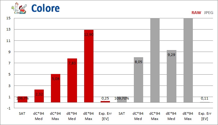 Comportamento cromatico più che buono, con saturazione ottimale, a patto di lavorare in buone condizioni di luce o di partire dal RAW, con possibilità dunque di effettuare un bilanciamento del bianco ottimale in post-produzione. Il JPEG in-camera, viceversa, potrebbe essere fortemente penalizzato da un punto di bianco anche vistosamente errato in presenza di luce artificiale.