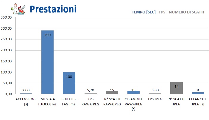 L'accensione e le prestazioni del sistema AF sono sotto la media. Buone invece, considerata la fascia di prezzo, le prestazioni in scatto continuo.
