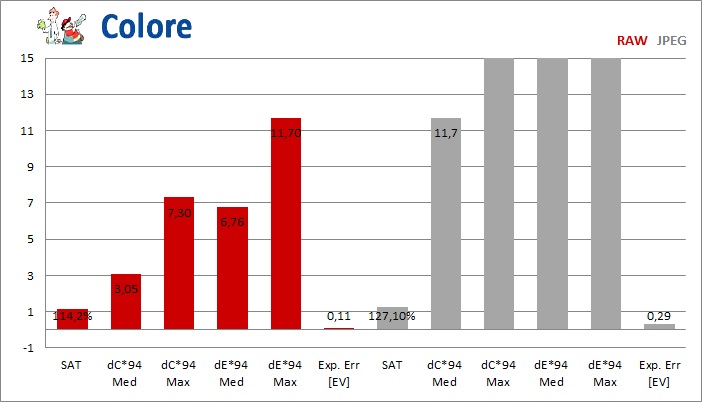 Il buon comportamento cromatico generale può essere fortemente penalizzato, nel caso del JPEG, da un bilanciamento del bianco non ottimale in presenza di luce artificiale. Consigliato, nel caso di scatto in formato JPEG, l'uso del bilanciamento del bianco manuale. Elevata saturazione del JPEG con impostazioni Standard.