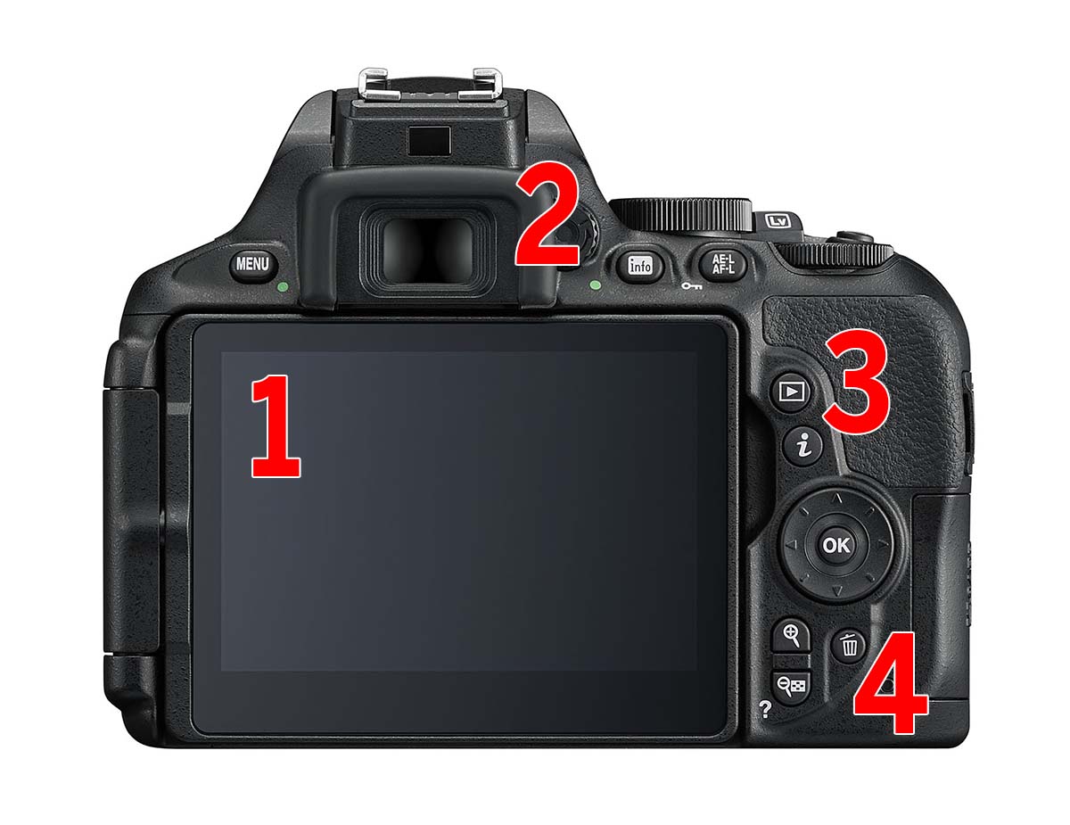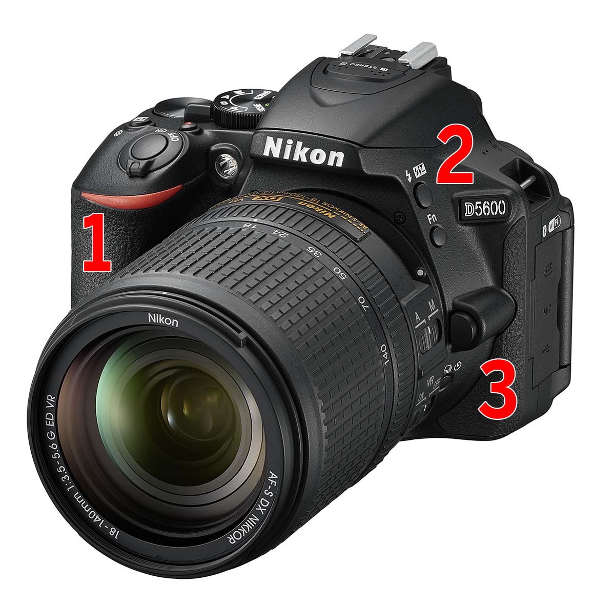 Le dimensioni, unite al display articolato (che impedisce di alloggiare pulsanti sul lato sinistro del dorso), obbligano però a qualche compromesso per quanto riguarda la dotazione di comandi: design a singola ghiera, niente joystick di selezione punto AF, nessun display superiore, e alcune scelte inusuali nella disposizione dei pulsanti (vedi #3 della vista frontale). A livello funzionale, insomma, e a dispetto della tradizionalmente buona qualità dei materiali, la D5600 è indubbiamente una reflex di livello base.