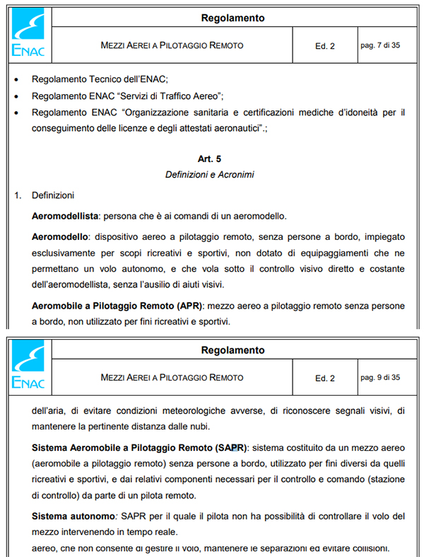 "Per aeromodello si intende un dispositivo aereo a pilotaggio remoto, senza persone a bordo, non dotato di equipaggiamenti che ne permettano un volo autonomo, impiegato esclusivamente per scopi ricreativi e sportivi, e che vola sotto il controllo visivo diretto e costante dell'aeromodellista, senza l'ausilio di aiuti visivi".