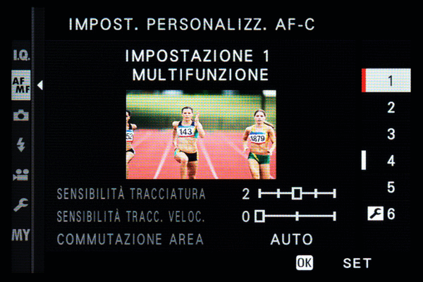 Il recente menu di impostazione AF, introdotto con la X-T2, offre 5 preset e una posizione custom. Si basa su tre parametri di gestione: Sensibilità tracciatura (Tracking sensitivity), Sensibilità tracc. veloc. (Speed tracking sensitivity), Commutazione area (Zone area switching). Sensibilità tracciatura determina la frequenza di ricalcolo (0=ricalcolo immediato, 4=massimo ritardo), da utilizzare per gestire gli "impallamenti" temporanei del soggetto. Sensibilità tracc. veloc. indica alla fotocamera come si muove il soggetto (0=velocità costante, 2=con accelerazioni improvvise). Commutazione area, che ha effetto solo quando si lavora in modalità Wide Tracking, indica infine alla fotocamera quale soggetto privilegiare, tra quello al centro, quello in primo piano o Auto (in quest'ultimo caso, viene privilegiato inizialmente il soggetto al centro, poi viene effettuato il tracking di quel soggetto).