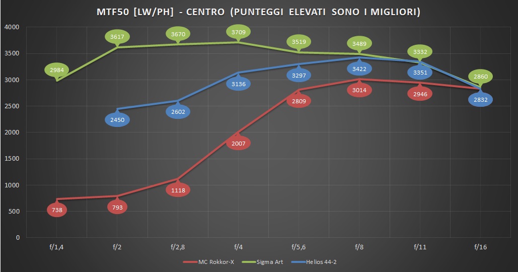 Il confronto con la precisione chirurgica dell'ottica Sigma mette in evidenza quelli che sono i limiti di una costruzione datata. Tanto per il Rokkor quanto per l'Helios, non è nella maggior risoluzione massima del Sigma (comunque superiore – ben 0,464 c/p!) che si trova il divario più evidente, ma nella sua capacità di mantenere tale livello di dettaglio a pressoché qualunque diaframma di lavoro. Impressionante che già alla massima apertura sfiori le 3000 LW/PH sulla Sony A7 Mark III.
