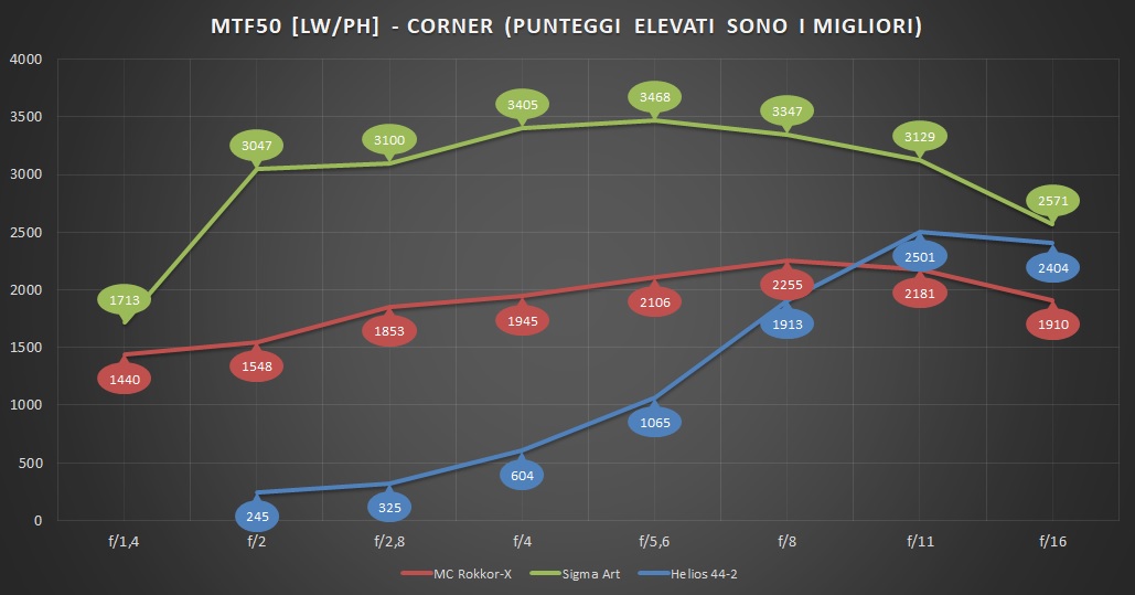 Si può dire che, in termini di puro potere risolvente, da f/8 in avanti i tre obiettivi siano confrontabili, con in particolare l'Helios che si toglie la soddisfazione di eguagliare il Sigma a f/11. Ai diaframmi più aperti, però, il divario cresce, arrivando a essere, in particolar modo per il Rokkor, davvero enorme.