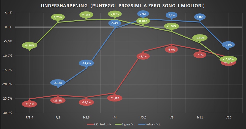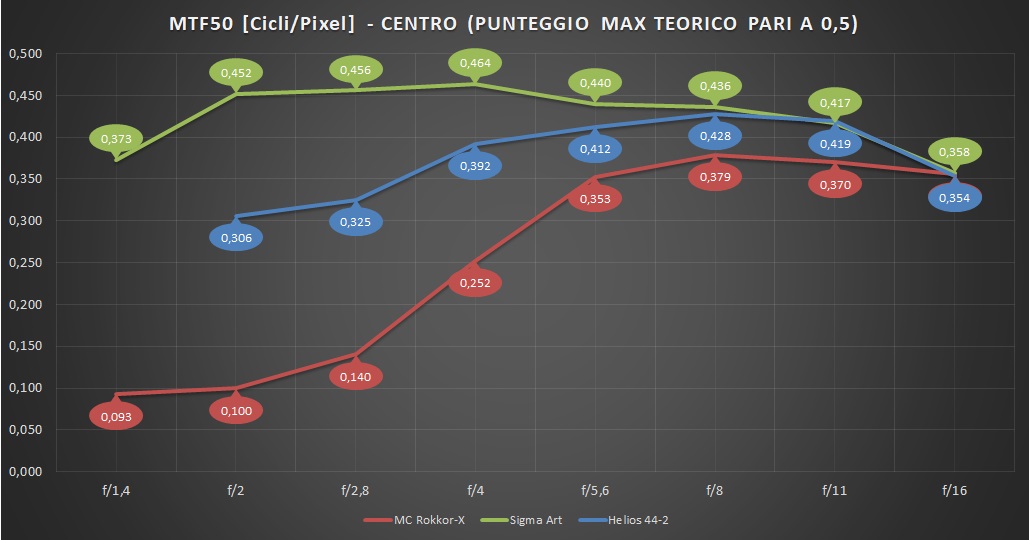 NOTA 2: Dovendo valutare obiettivi diversi a diversi diaframmi di lavoro, e non il corpo macchina come consueto, abbiamo scelto in questo caso di non regolare il parametro Nitidezza per ottenere un valore di sharpening ottimale al miglior diaframma di lavoro, ma di utilizzare i parametri di sviluppo standard di Lightroom (Nitidezza = 40, Raggio = 1) per tutti gli obiettivi e a tutte le aperture. Questo significa che, nelle immagini reali, esisterà un piccolo margine di miglioramento rispetto al quadro qui dipinto per quanto attiene in particolare alla nitidezza a tutta apertura.