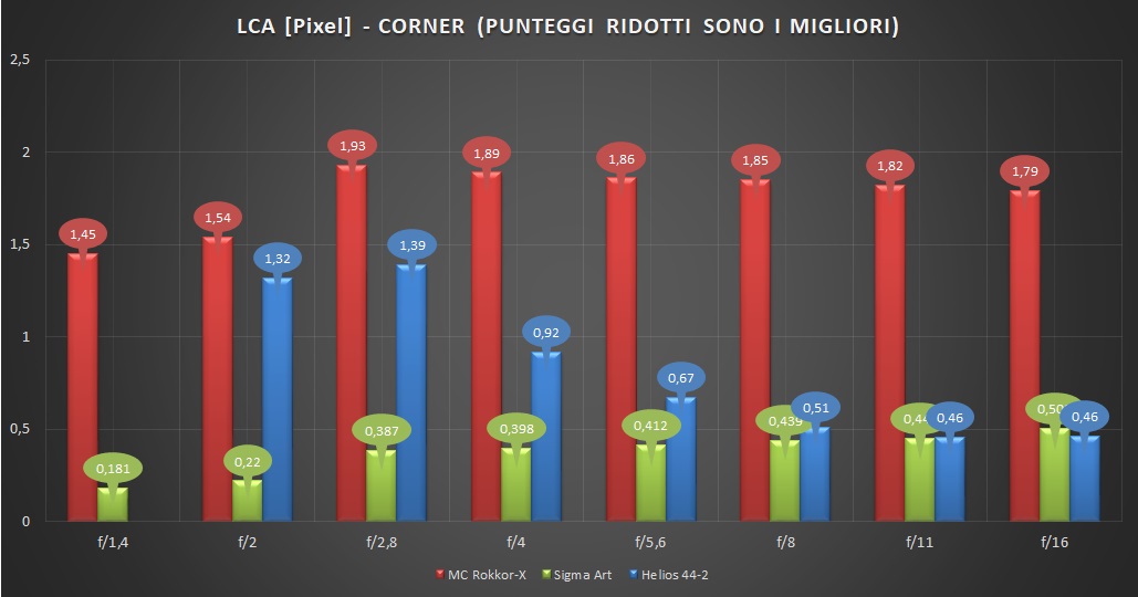 In termini di aberrazione cromatica laterale, invece, è il Rokkor a subire il distacco maggiore, con l'Helios che, grossomodo, regge il passo.