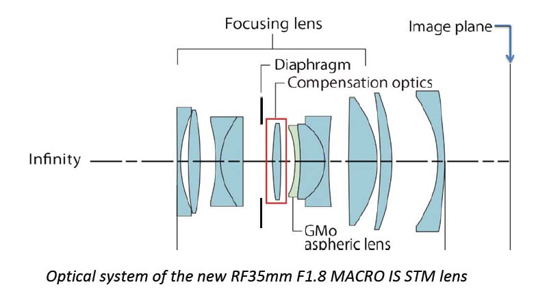 Il 35mm, infine, è il classico grandangolare moderato, compatto, ideale per reportage e street. Macro 0,5x, può riempire il fotogramma con oggetti di dimensione di un biglietto da visita, ed è stabilizzato. Il suo design a confronto con la versione EF (f/2), mostra, più di altri, il radicale cambiamento di progetto portato dall'attacco RF: elementi frontali molto piccoli grazie al diaframma spostato in avanti, eppure luminosità leggermente superiore. Il ridotto ingombro anteriore consente di alloggiare, tra l'altro i motori di messa a fuoco lineari (dato che, in questo schema, sono gli elementi frontali quelli deputati alla messa a fuoco). Viceversa, l'elemento finale è molto più ampio, per migliorare le performance ottiche ai margini del sensore. Canon sostiene che questo 35mm "serie standard" avrà prestazioni ottiche simili all'attuale EF 35mm f/1.4L.
