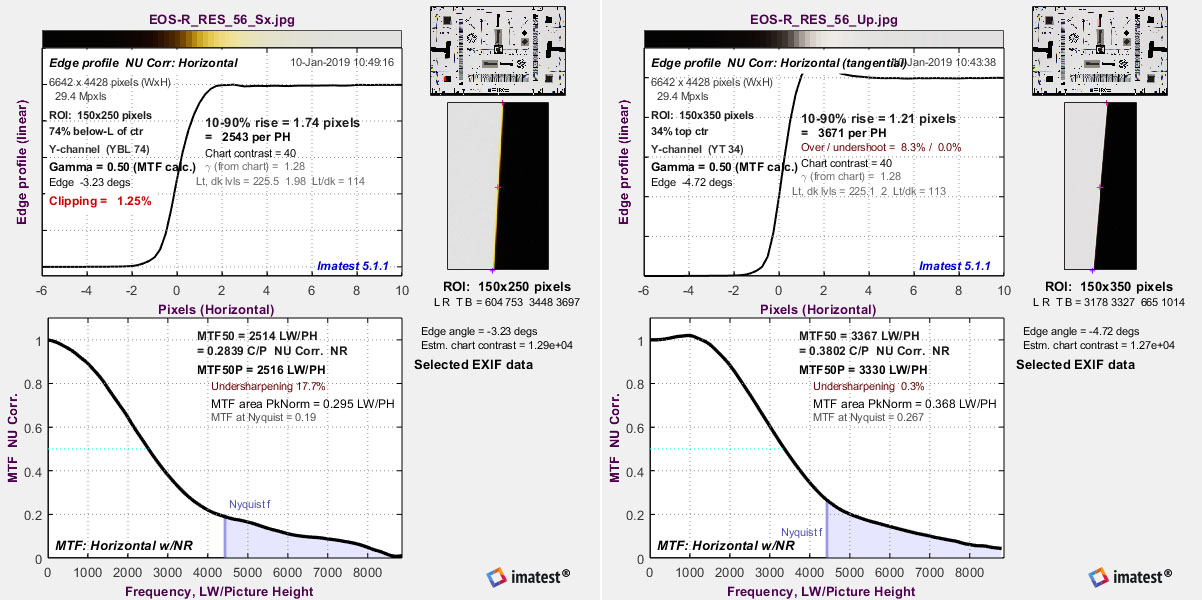 Valgono, quindi, analoghe considerazioni: forte dei suoi circa 30 Mpixel, in termini di dettaglio questo sensore mostra un piccolo ma visibile margine di vantaggio sia rispetto alle reflex di generazione precedente alla 5D Mark IV sia alle concorrenti da 24 Mpixel. In termini numerici, se la 5D Mark IV sfiorava le 3300 LW/PH, la EOS R supera regolarmente questo limite, attestandosi mediamente intorno alle 3350 LW/PH.