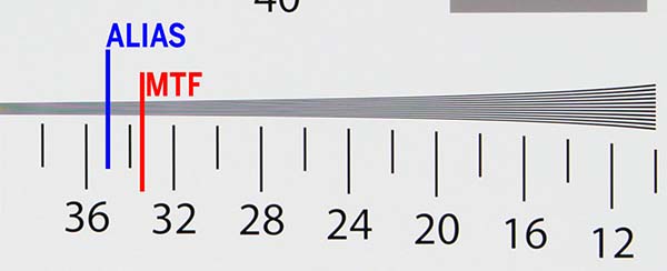 Non male per un sensore dotato di tradizionale filtro Low-Pass – grazie alla sua presenza, fenomeni di alias (sempre ridotti) compaiono tra le 3500 e le 4000 LW/PH in funzione dell'ottica utilizzata, e non rappresentano dunque un problema, nonostante l'elevato livello di dettaglio leggibile.