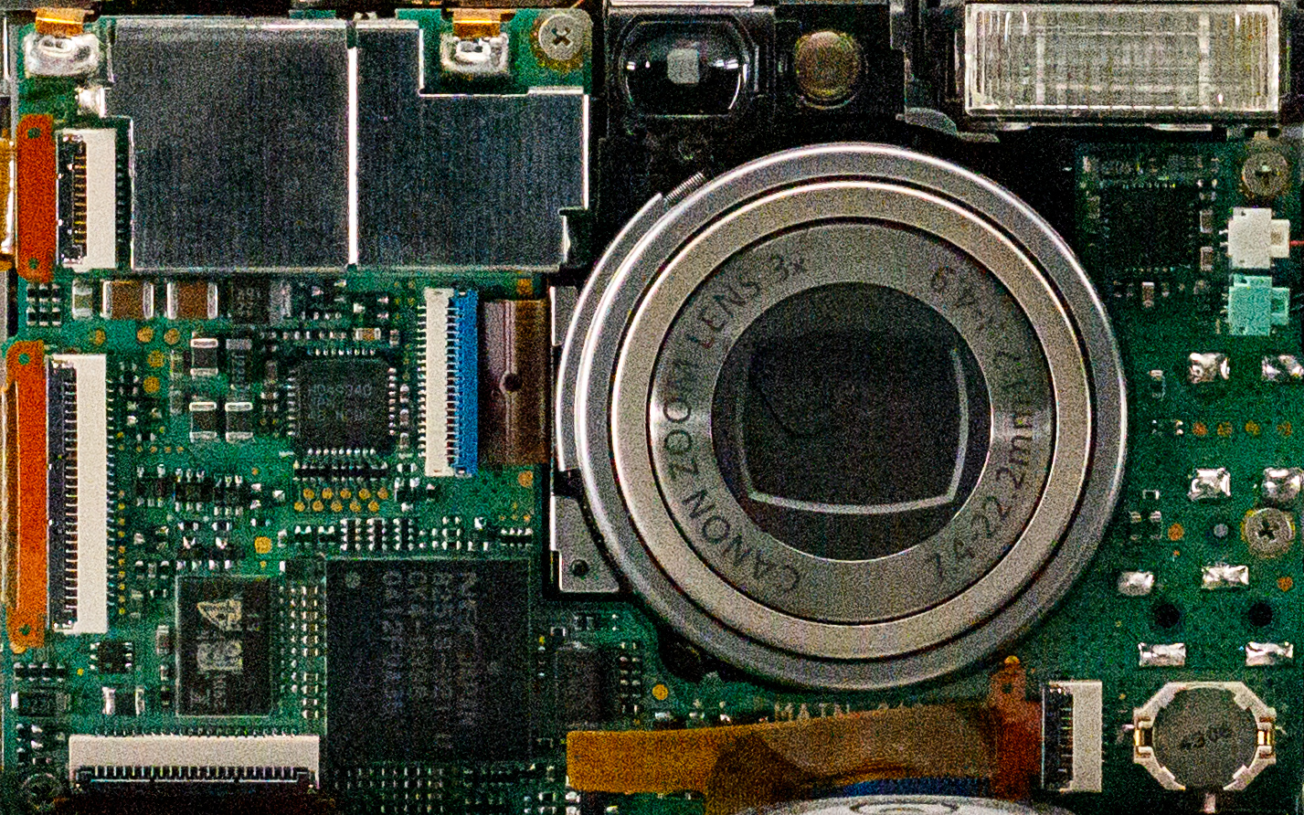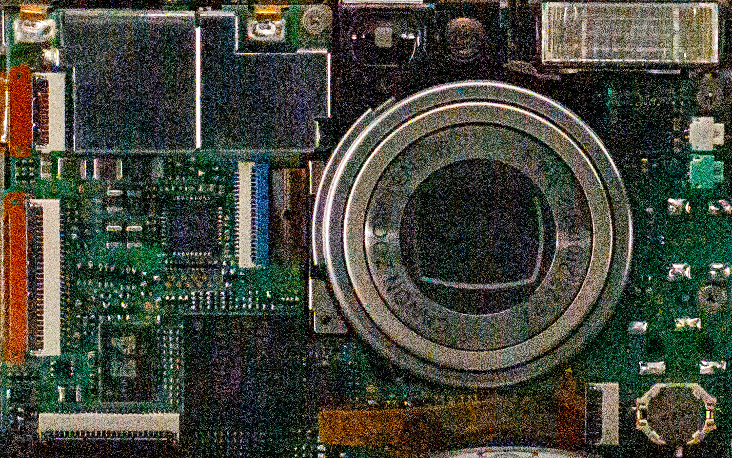 Dall'alto: particolare ripreso a 12800 ISO, nessuna elaborazione in post-produzione. Al centro: stesso particolare ripreso a 800 ISO (-4 EV), quindi sovraesposto di 4 EV in post-produzione; le differenze sono minime, e rivelano la sostanziale ISO-invarianza della EOS R oltre i 400 ISO. In basso: particolare ripreso a 400 ISO (-5 EV), quindi sovraesposto di 5 EV in post-produzione; compare un leggero banding.