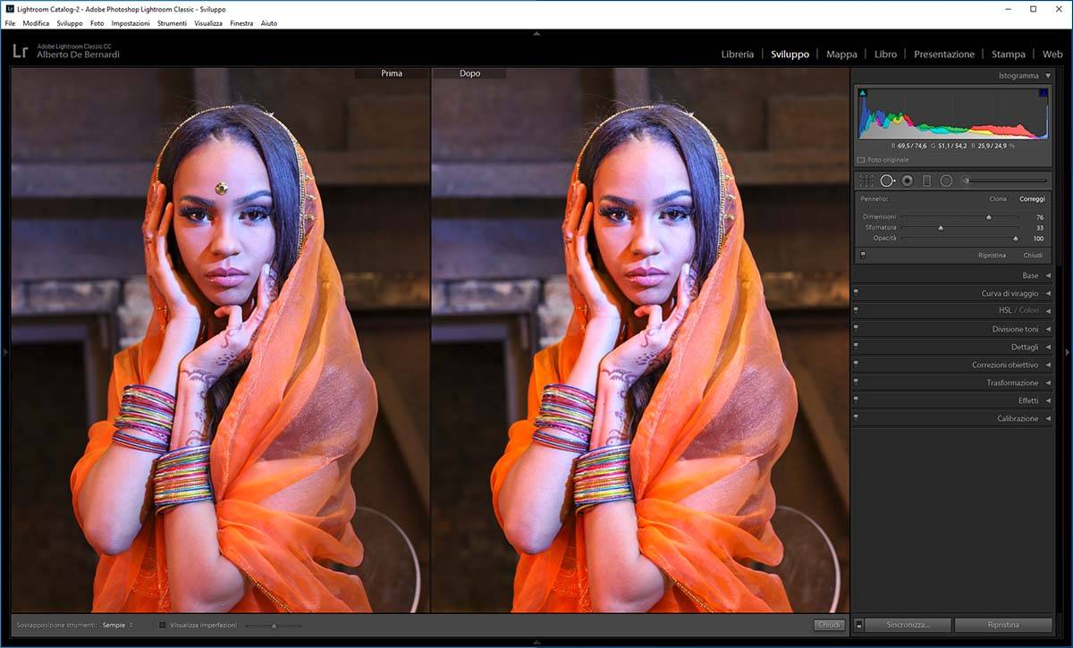 Il procedimento per rimuovere piccole imperfezioni dal volto di una persona ritratta è identico. In questo caso, il nostro unico consiglio è quello di non eccedere. Attivando Visualizza imperfezioni con una soglia elevata, si può essere infatti tentati di effettuare un'infinità di correzioni, specie lavorando con moderne ottiche super-nitide. Questo, oltre che essere a nostro avviso eticamente discutibile, porta spesso a risultati innaturali e sgradevoli.