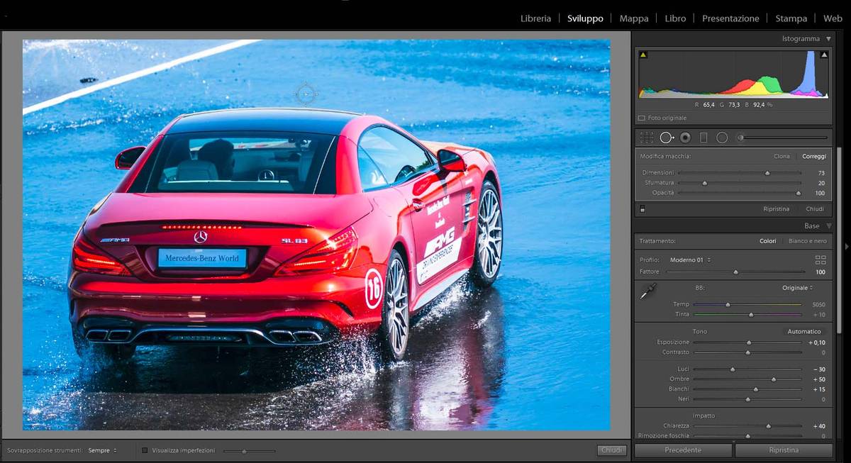 Rimozione macchie (Q), secondo strumento da sinistra sotto l'istogramma, è molto efficace per rimuovere dall'immagine elementi indesiderati, siano essi microscopici, come delle macchie causata da polvere sul sensore, o macroscopici, come i cavi dell'alta tensione all'interno di un paesaggio.