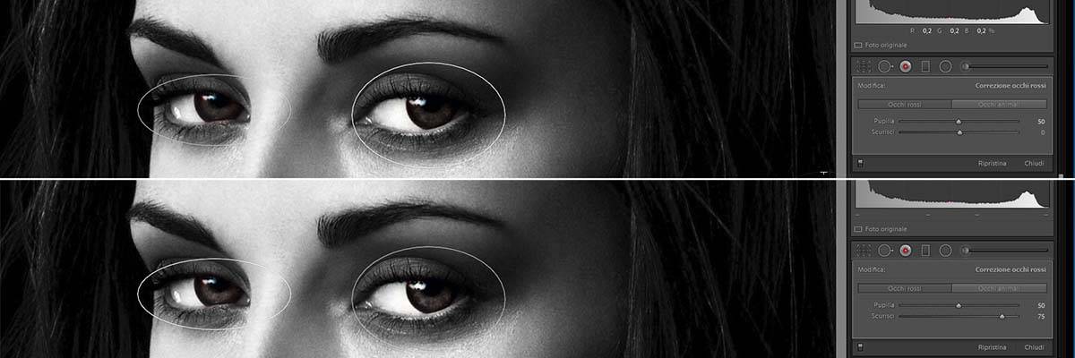 Nel caso in cui non siano stati adottati questi accorgimenti, Lightroom ci "mette una pezza", facendo un'operazione molto semplice: individua le zone di colore rosso all’interno dell’area selezionata e le trasforma in grigie o nere. La stessa operazione potrebbe essere fatta con i Pennelli, di cui parleremo tra poco, ma Occhi rossi offre alcuni automatismi che ne rendono l'uso decisamente vantaggioso.