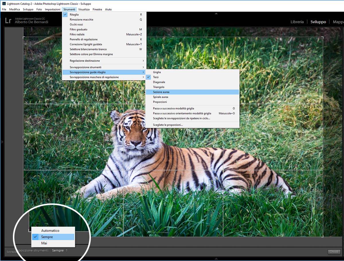 Nell'angolo inferiore sinistro del quadro si trova la voce [Sovrapposizione strumenti]. Scegliendo [Sempre], verrà mostrata la guida di ritaglio selezionata attraverso il menu Strumenti > Sovrapposizione guide ritaglio. La scelta più comune è la guida che segue la nota regola dei terzi, ma anche in questo caso esistono diverse opzioni da selezionare in base alle proprie preferenze e necessità. Ad esempio, nella fotografia di architettura, Griglia può essere una buona scelta. È possibile scorrere ciclicamente le varie guide premendo (O), o nascondere la guida premendo (H).