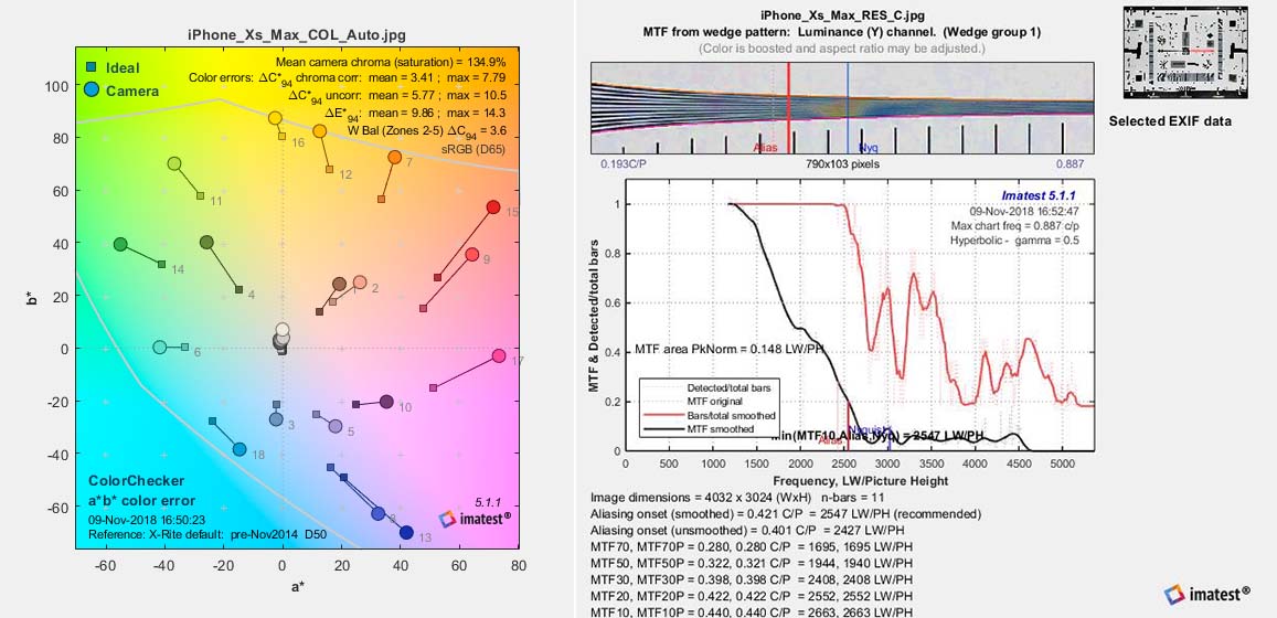 Apple ha viceversa deciso di spingere molto di più sull'acceleratore per quanto concerne la resa cromatica. Con una saturazione che sfiora il 135%, i colori sono estremamente vividi e risultano per questo accattivanti per la maggioranza degli osservatori. Di contro, complice anche un errore evidente sul punto di bianco (problema comune a pressoché tutti i modelli in gara), la fedeltà cromatica risulta decisamente modesta.