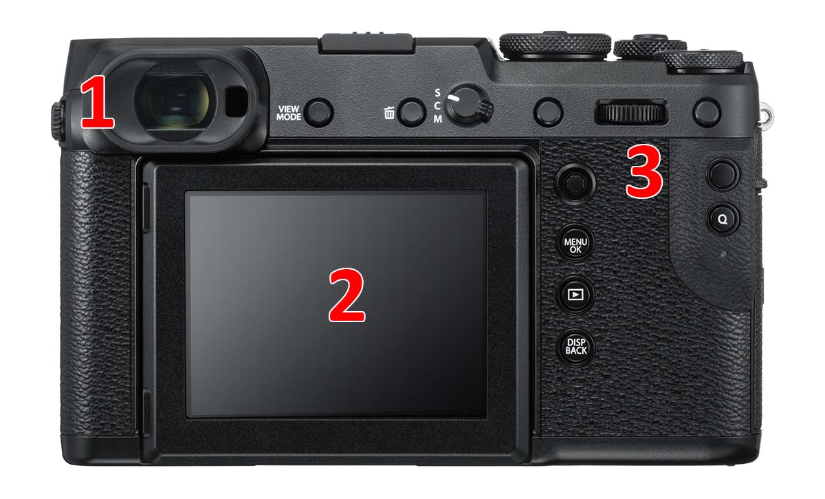 1 – Il mirino EVF utilizza lo stesso schermo OLED da 0,5" e 3,69 milioni di punti della 50S. Un diverso e più compatto sistema di lenti limita però leggermente il fattore di ingrandimento, che in questo caso si ferma a un comunque ottimo 0,77x. L'identico, generoso eye-point di 23mm contribuisce a fare di questo mirino uno strumento molto confortevole.