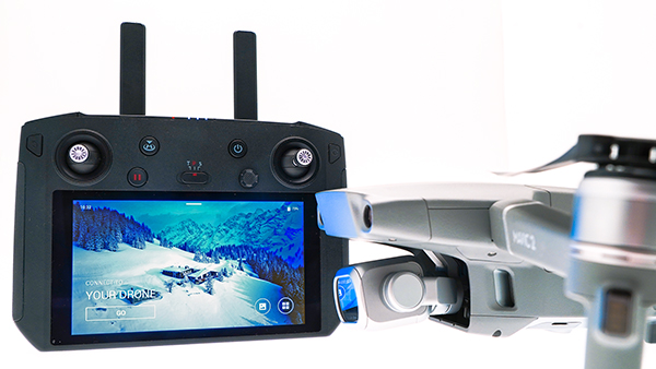 Quest'ultimo è un oggetto parecchio costoso (649€) ma per chi fa un uso professionale è un deciso passo avanti rispetto al controller normale. Basato su Android unisce radiocomando e smartphone e non utilizza la carica di quest'ultimo: sono così solo due i dispositivi da caricare per poter volare e non tre come invece accade con il radiocomando standard (Drone + remote controller + smartphone). DJI Smart Controller offre inoltre più tasti personalizzabili come scorciatoia, è impugnabile in modo molto più saldo, offre un'uscita HDMI per salvare il flusso video Full HD in modalità Live, ha una resistenza maggiore dei classici smartphone agli agenti ambientali (è utilizzabile in un intervallo di temperature che va da -20°C a +40°C), ma soprattutto è dotato di un ampio display Full HD da 5,5" perfettamente visibile anche in pieno sole. Promette 1000 cd/m2, ma nelle nostre misurazioni è andato anche oltre il tetto delle 1000 candele, confermando la perfetta visibilità fatta registrare nell'uso sul campo. Supporta la tecnologia OcuSync 2.0 con trasmissione del flusso video in Full HD fino a 40 Mbit e distanze fino a 8 km.