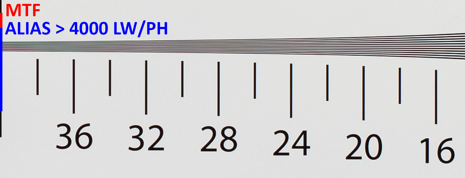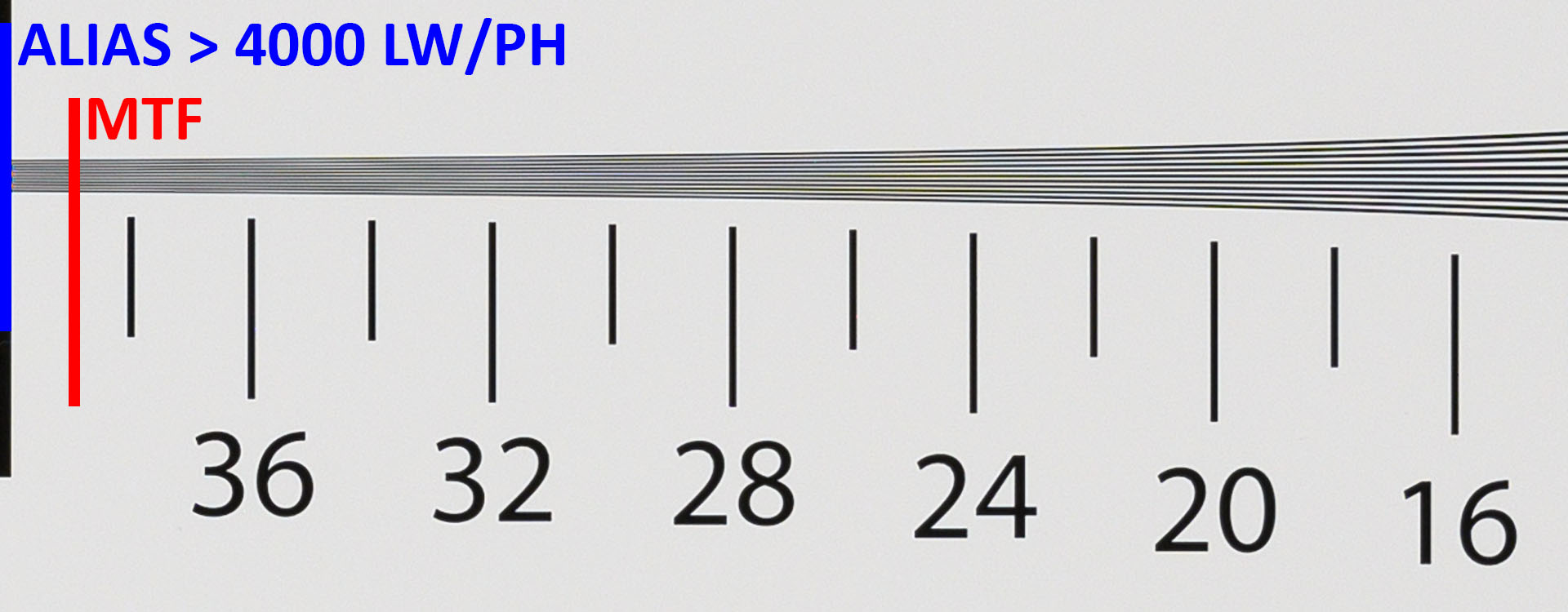 Non si registrano fenomeni di aliasing entro le 4000 LW/PH (vale a dire oltre 80 coppie di linee per millimetro), dato che conferma ancora una volta come, soprattutto per sensori di altissima risoluzione, la scelta di fare a meno del filtro AA abbia perfettamente senso – la probabilità di imbattersi in pattern di interferenza / effetti moiré nel lavoro quotidiano è davvero minima.
