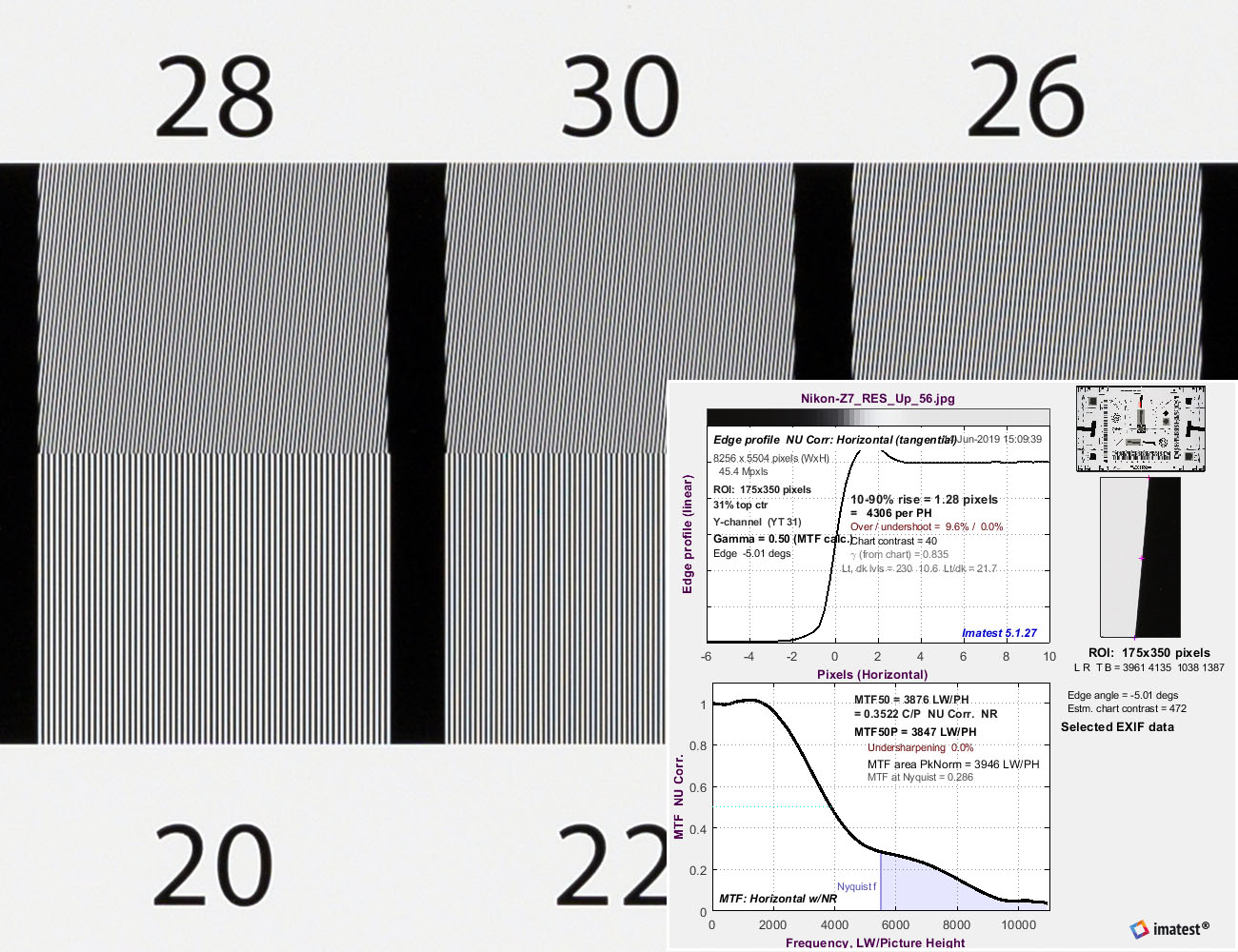 Come ci si aspetta da un sensore da 45 Mpixel, le immagini prodotte dalla Z7 mostrano un eccellente livello di dettaglio. In termini assoluti, la Z7 con 24-70mm f/4 S ha fatto registrare poco meno di 3900 LW/PH, risultato analogo, anche se leggermente inferiore, a quello della rivale Sony A7R III (oltre 4000 LW/PH); lo scarto rispetto alla D850 (circa 4300 LW/PH) è più evidente, ma in entrambi i casi la differenza è imputabile principalmente all'ottica.