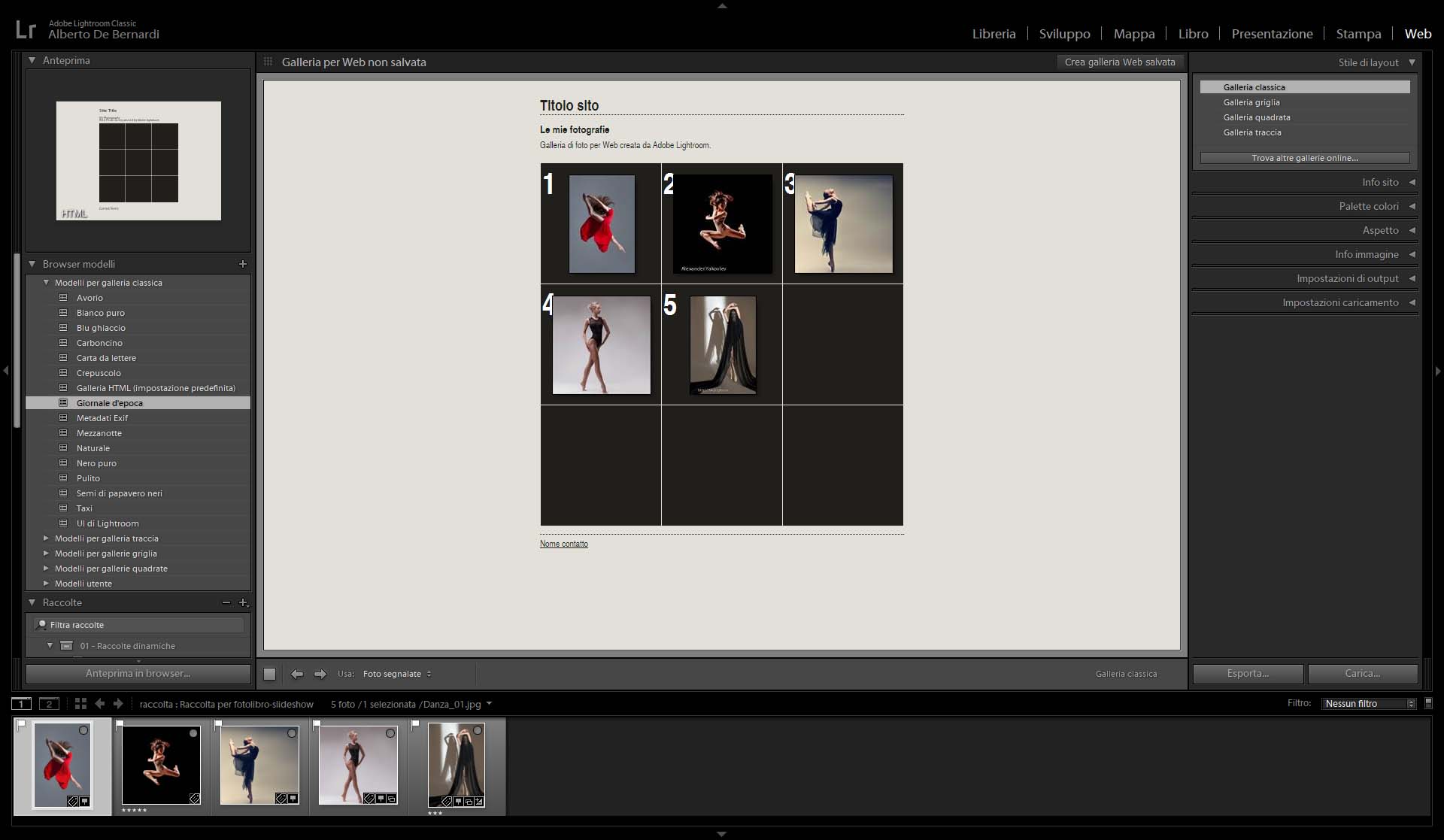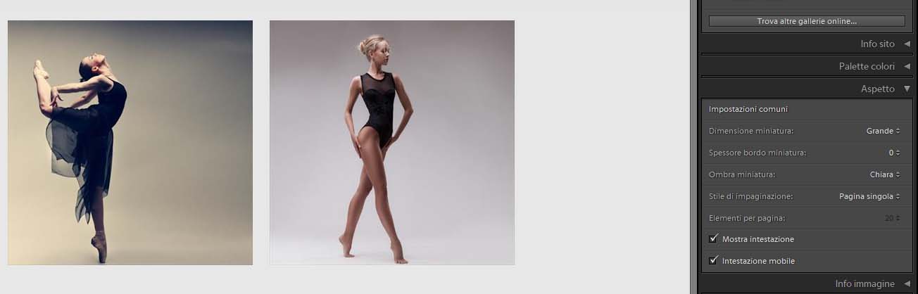 Cliccando su una miniatura si può già avere una veloce anteprima del funzionamento della gallery entro Lightroom, ma per un'anteprima più realistica è possibile cliccare sul pulsante [Anteprima nel browser], in basso nella colonna di sinistra. Al termine, il pulsante [Esporta], in basso nella colonna di destra, crea la struttura (file index.html e le cartelle assets e images, che contengono fogli di stile, javascript, miniature e immagini a piena risoluzione). Per salvare il template del sito, invece, bisogna premere [Crea galleria web salvata], in alto a destra; la galleria apparirà tra le Raccolte.