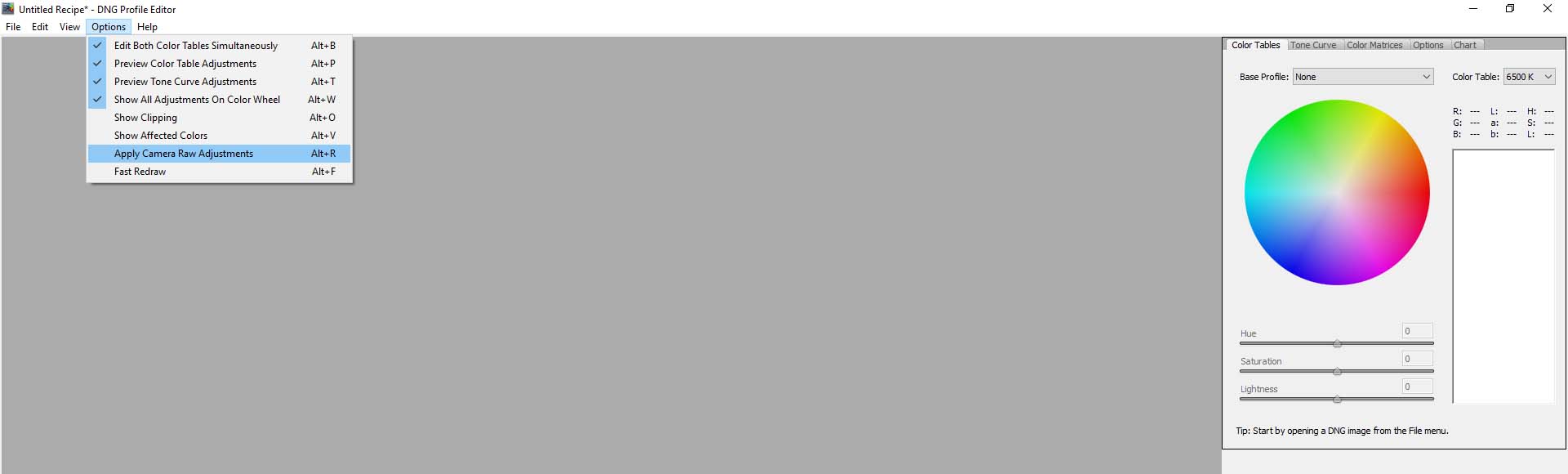 Il software DNG Profile Editor può essere scaricato dal sito Adobe Digital Negative (DNG). È gratuito e non richiede installazione. All'interno del software disattivare, se non lo è già, la voce di menu Options > Apply Camera RAW Adjustments. Questo fa sì che ogni correzione eventualmente applicata al RAW venga ignorata.