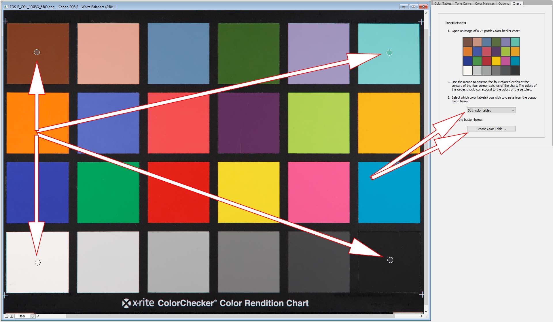 Aprire il primo DNG con il comando File > Open DNG Image… e, nella colonna di destra, selezionare la scheda Chart. Compariranno quattro piccoli cerchi, da trascinare con il mouse e posizionare grossomodo al centro delle quattro patch agli angoli.