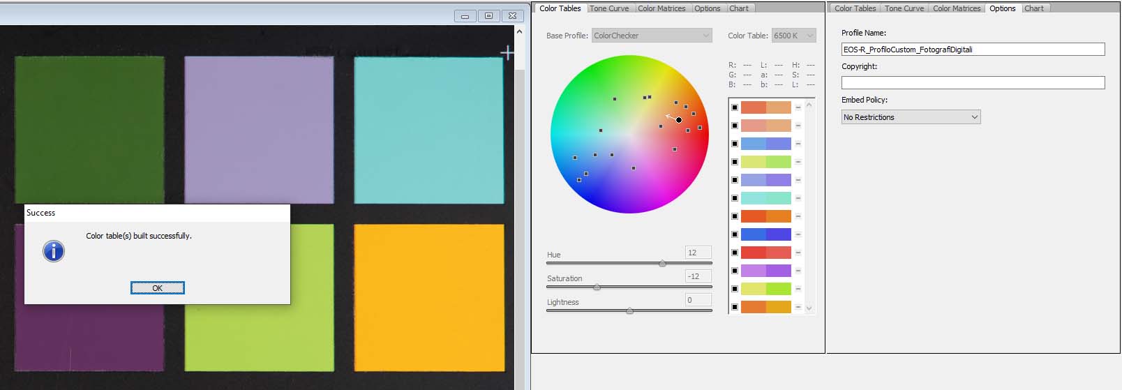 In caso di problemi (illuminazione non uniforme, presenza di dominati), il software restituirà un avviso, e si dovrà fotografare di nuovo il target correggendo il problema. In assenza di errori, viceversa, non resta che dare un nome al profilo nella scheda Options (salvo particolari esigenze di riservatezza, impostare Embed Policy: No Restrictions) e cliccare su File > Export... per salvare il profilo. Se si desidera, è possibile salvare anche la sua ricetta (Save recipe) per modifiche future.