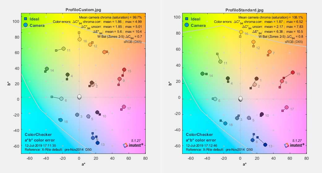 Confronto tra profilo Standard e Custom per la EOS-R, una delle più fedeli da noi provate dal punto di vista cromatico. Il miglioramento esiste, soprattutto in termini di saturazione, ma il profilo Standard, già ottimo, è a un soffio di distanza (e molti potrebbero preferire la sua maggior saturazione).