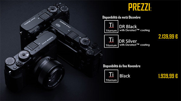 Con la nuova X-Pro3 Fujifilm pare aver centrato il bersaglio, aumentando le differenze di connotazione con la serie X-T e dotando la nuova nata di un'anima molto particolare, tale da strizzare l'occhio anche a chi amerebbe avere una Leica M10-D, ma non se la può permettere. Il prezzo di X-Pro3 non è contenuto, ma in parte è giustificato dal particolare mirino ibrido, prodotto solo per Fuji; inoltre i tecnici giapponesi hanno scelto il titanio come materiale per le calotte superiore e inferiore (oltre al telaio interno in pressofusione di magnesio). La versione nera si posiziona a 1.939,99 €, mentre esistono anche due livree con trattamento superficiale in Duratec, che aumenta di dieci volte la resistenza alle abrasioni, che costano 2.139,99 € e hanno un colore grigio scuro canna di fucile (DR Black) e argento (DR Silver). Prezzi abbastanza elevati, ma che testimoniano come Fujifilm voglia giocare su un altro campo con queste nuove Fujifilm X-Pro3.