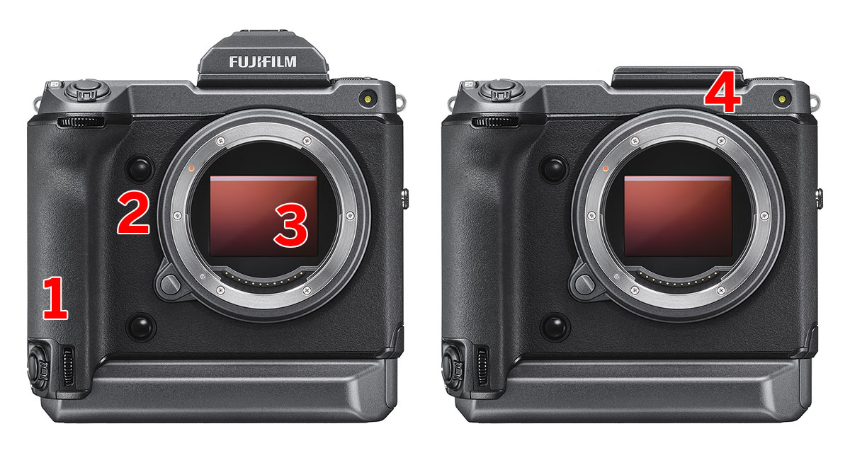 4 – Ecco come si presenta anteriormente la GFX 100 senza mirino.