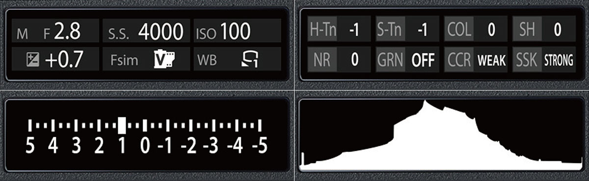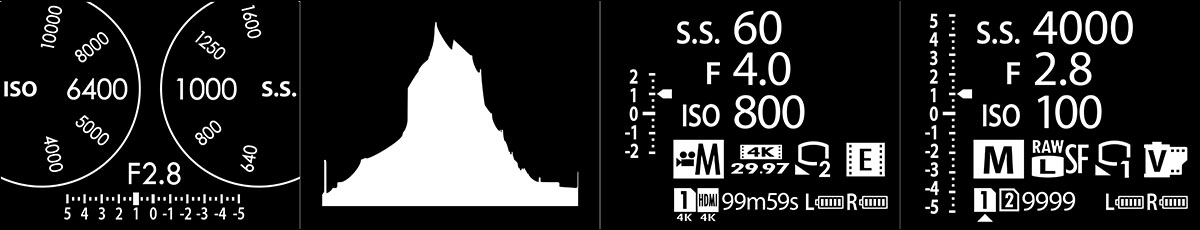 3 – Il terzo display LCD ausiliario può essere anch'esso ampiamente personalizzato – le due schermate informative, anche in questo caso separate per foto e video, possono infatti mostrare, a scelta del fotografo, pressoché qualunque parametro operativo. Qui sopra, le quattro schermate principali.