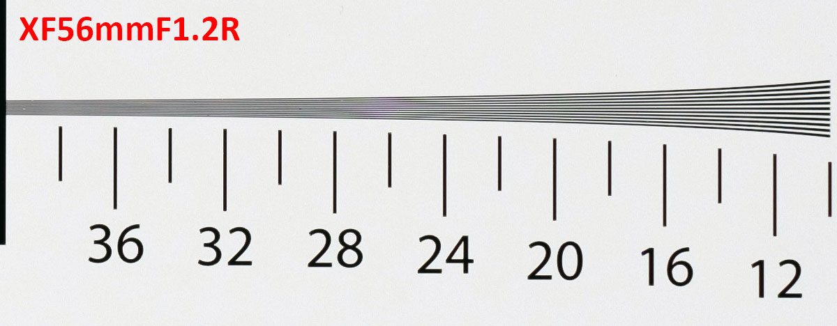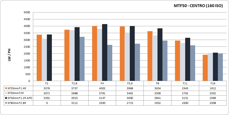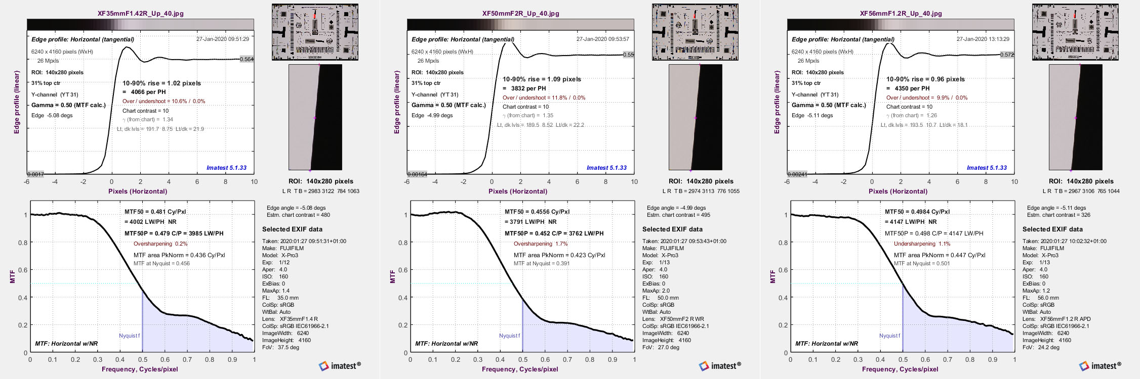 Grandissimo obiettivo il 56mmF1.2, che a dispetto dell'apertura massima molto elevata, solo tra f/1.2 e f/1.4 mostra un accenno di ammorbidimento con punteggi – comunque elevati in assoluto – a ridosso delle 2000 LW/PH. Basta chiudere a f/2 per balzare ben oltre le 3000 LW/PH, e raggiungere punteggi persino superiori a quelli del 35mm. In termini di analisi hyperbolic wedge, parliamo di 3075 LW/PH per l'MTF 50P contro le già citate 3010. In sintesi, uno sfocato spettacolare unito a un'incisività eccezionale tra f/2 e f/11 compresi. Buono, anche se meno eclatante, il comportamento del nuovo 80mm Macro, che supera agevolmente le 3000 LW/PH a f/2.8 e che mediamente si attesta tra le 2600 e le 2700 LW/PH.