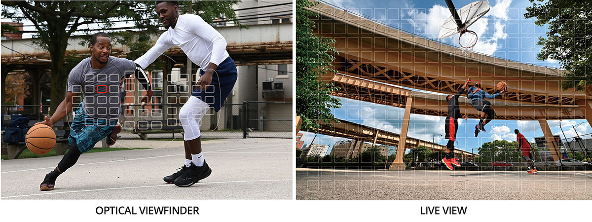 Disposizione e copertura dei punti AF in modalità mirino e live View.