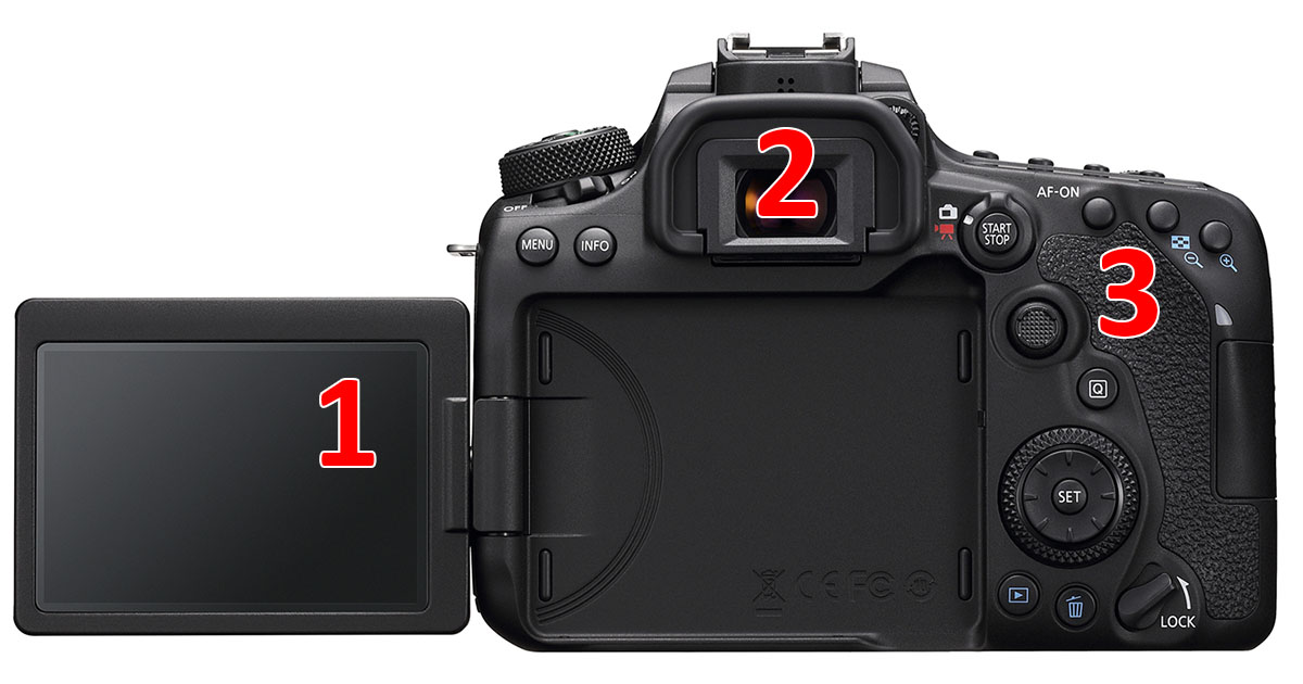 1 – Il display posteriore da 3" e 1.040.000 punti di risoluzione, invariato rispetto alla 80D, è incernierato a sinistra e consente una rotazione di 180° e 270° sui due assi.