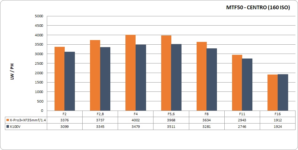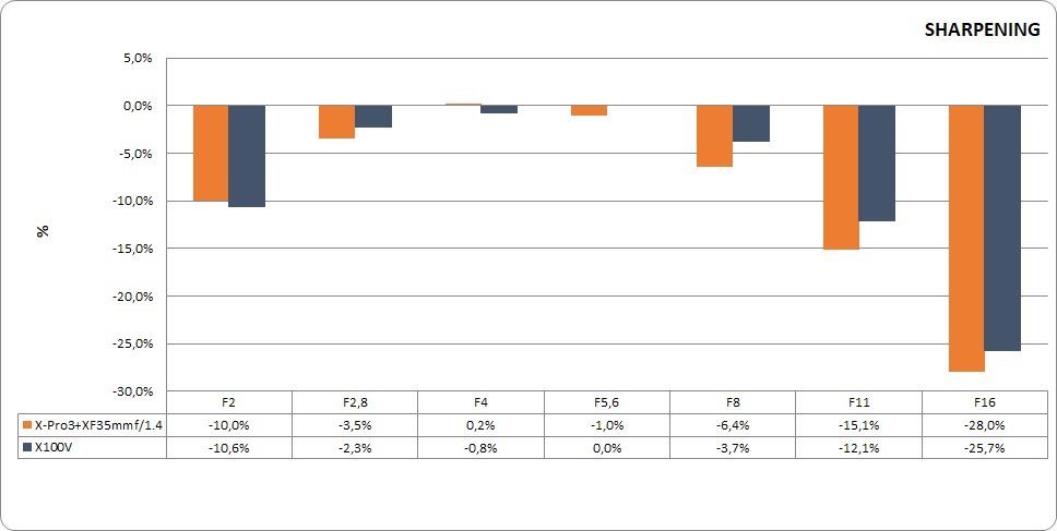 Il suo comportamento è riassunto dai grafici qui sopra, che lo vede a confronto con X-Pro3 equipaggiata con obiettivo XF35mm f/1.4. Fujifilm è effettivamente riuscita a spremere un pizzico di risoluzione in più, mantenendo quasi inalterato il dato massimo in cicli/pixel nonostante l'incremento di Mpixel del sensore. Ma soprattutto, è riuscita a migliorare molto la nitidezza tra f/2 e f/2.8 (vedi anche sezione Qualità d'immagine). La X100V è infatti capace di rimanere oltre quota 3000 LW/PH tra f/2 e f/8 compresi, il che fa di lei una fotocamera molto ben sfruttabile in diverse circostanze. Chi ama, secondo la "vecchia scuola", lavorare con messa a fuoco fissa sulla distanza iperfocale, a f/5.6 (miglior diaframma di lavoro per questo obiettivo) tale distanza è 4,7m, che porta ad avere un limite inferiore della profondità di campo a circa 2,35m.