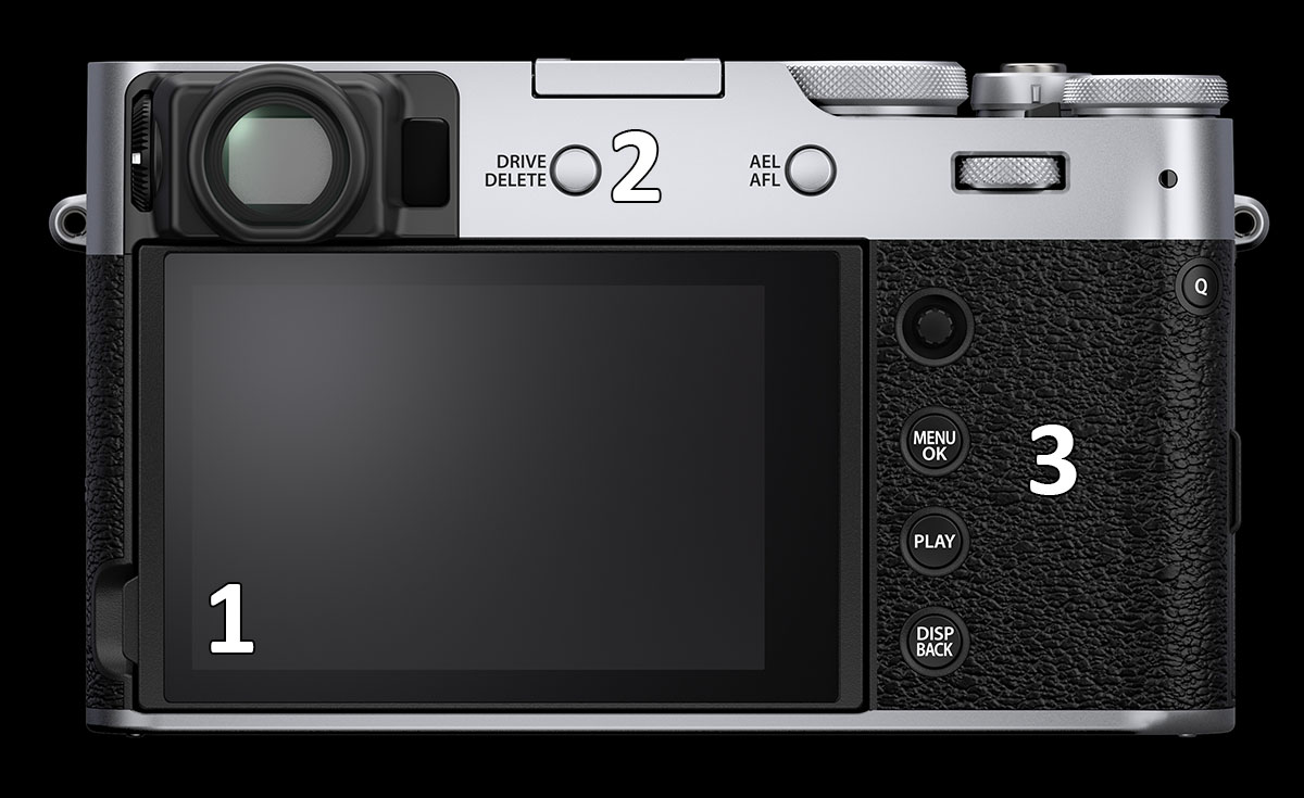 2 – La scomparsa del PAD ha costretto a rivedere la disposizione di alcuni comandi. La funzione Drive, in precedenza scorciatoia del PAD, è ora assegnata a questo pulsante, che in precedenza gestiva la modalità del mirino. Inutile sottolineare come il numero di controlli diretti si sia ridotto, ma questo tipo di corpo macchina, con la sua operatività "meccanica", necessita effettivamente di pochi pulsanti.