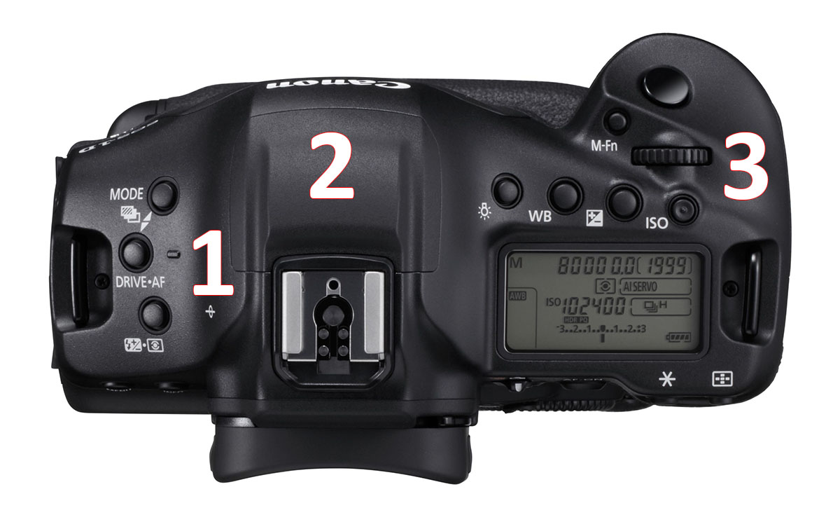 Invariata la disposizione dei pulsanti superiori, già dalla Mark I. Mancando sui corpi EOS 1D la ghiera di selezione dei programmi, l'impostazione è affidata al pulsante Mode, disposto a sinistra insieme ai pulsanti Drive-AF e Compensazione FE-Modalità esposimetrica. Premendo contemporaneamente i primi due si attiva la funzione bracketing.
