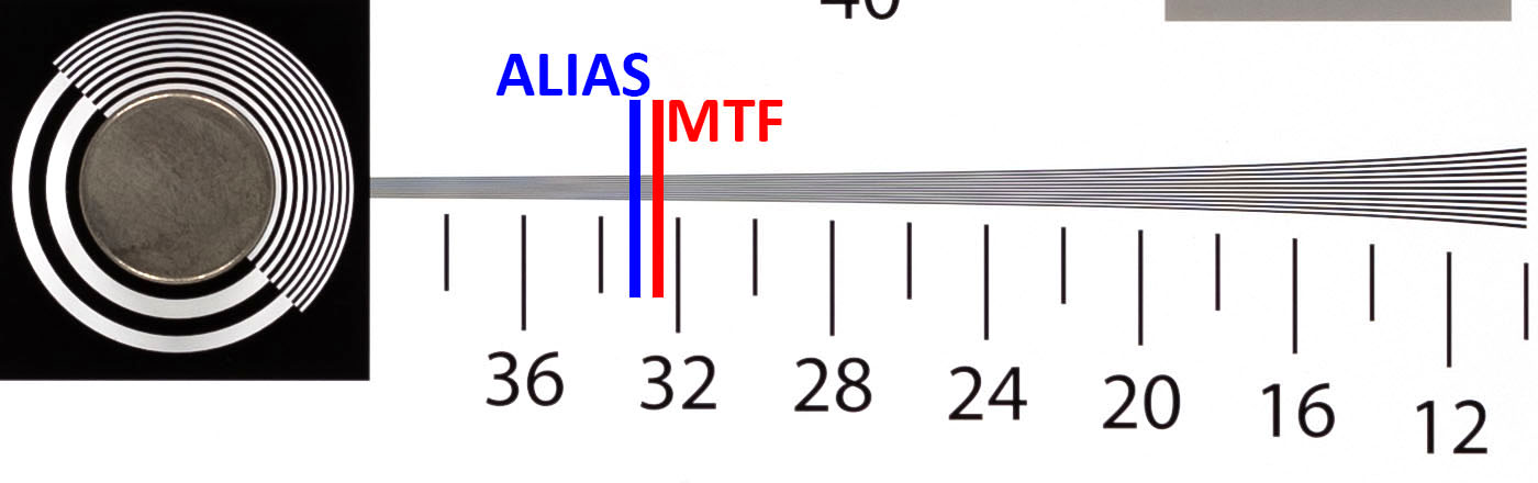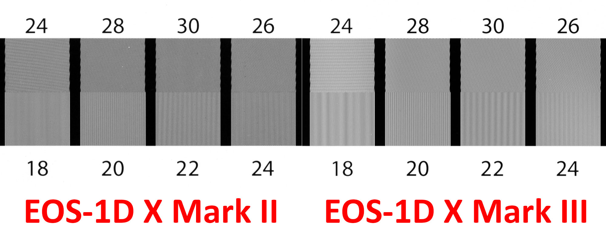 I risultati danno ragione a Canon: il punteggio MTF, a parità di ottica e condizioni di scatto, è cresciuto di circa 200 LW/PH rispetto alla Mark II, da 3050 a 3257 LW/PH (3250 MTF 50P). Anche visivamente, si nota una maggiore incisività nei dettagli fini che, nel complesso, da un senso di maggior nitidezza generale, facilmente percepibile a colpo d'occhio. Questo senza, effettivamente, incrementare l'incidenza dell'effetto moiré – sia analiticamente (moiré spread 0,3-0,7 c/p = 0.0252) sia visivamente (vedi confronto con 1D X Mark II), si nota infatti un comportamento pressoché identico a quello del precedente modello.